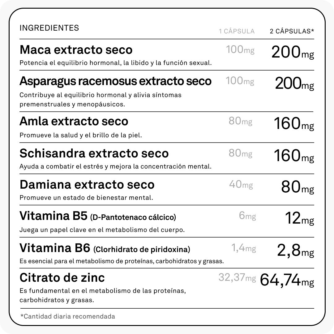 Suplemento nutricional específico para síntomas de perimenopausia como sofocos, fatiga, cambio de humor…